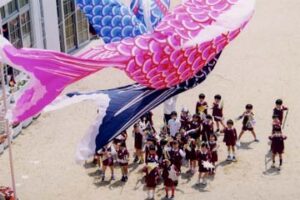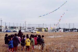 クラスのみんなで力をあわせて作った連凧が空高くあがりました。