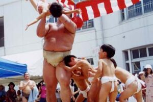 さあ、先生達も力士さんと力くらべ。子供達の応援にこたえます。